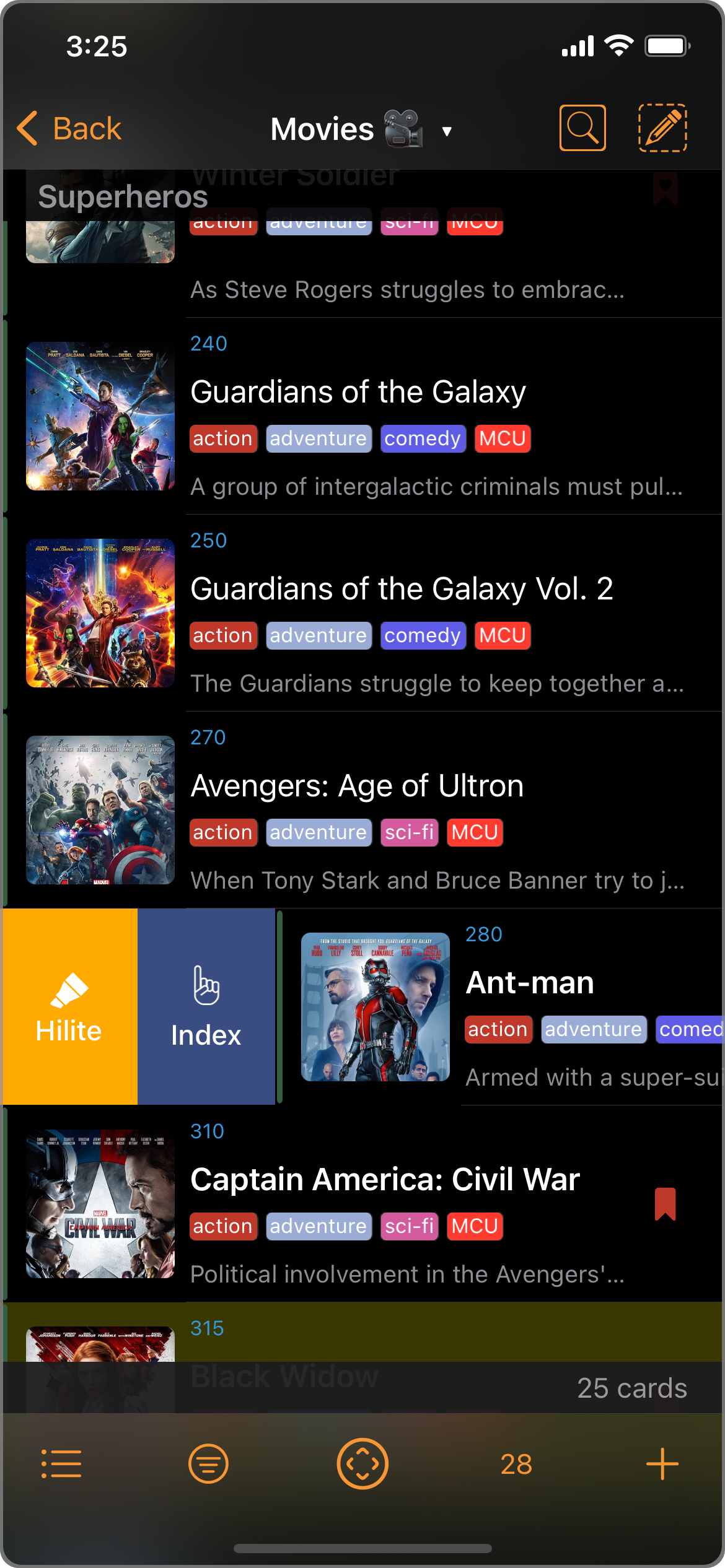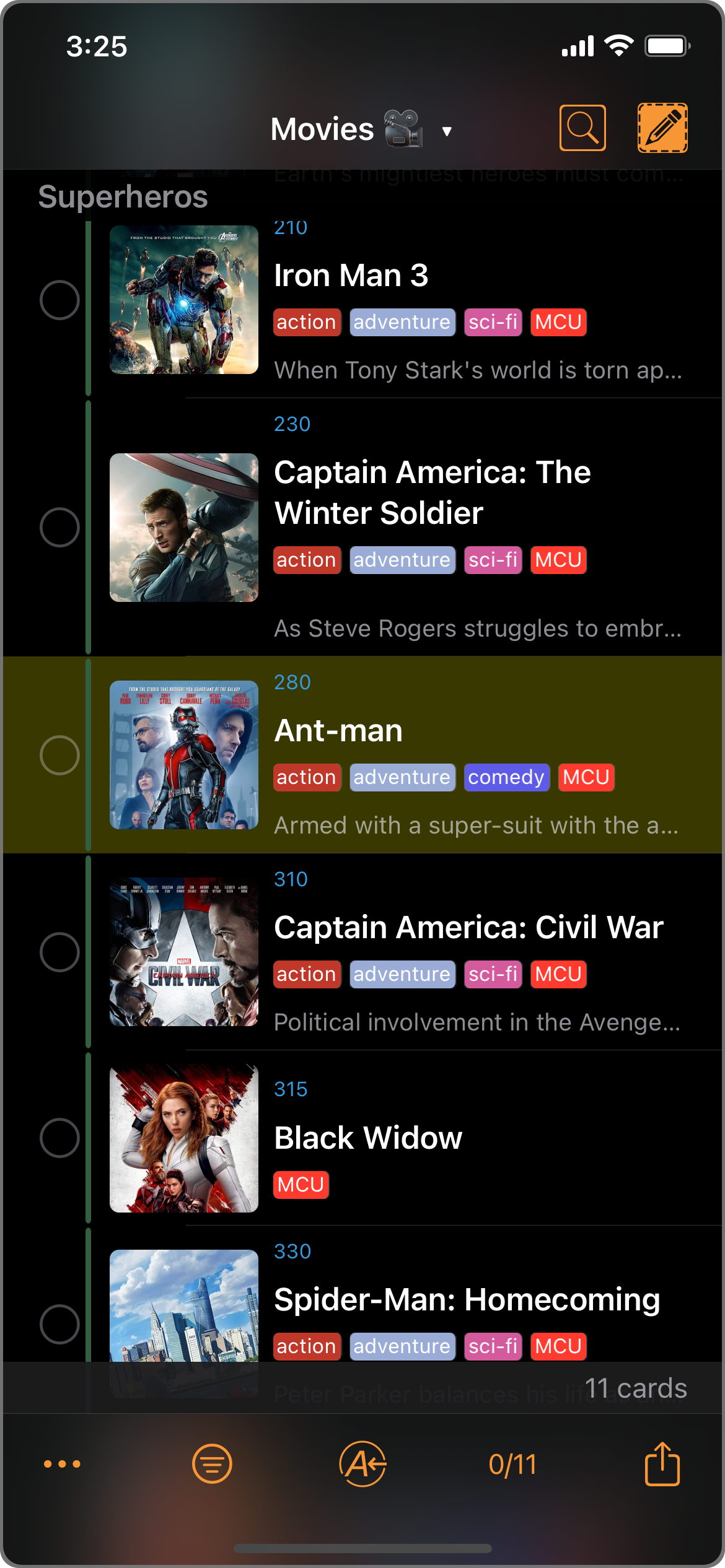 In this example, since the Picker was active, the new Card is AutoFilled with the "Superheros" category, the "MCU" tag, and a "marked" status.